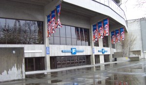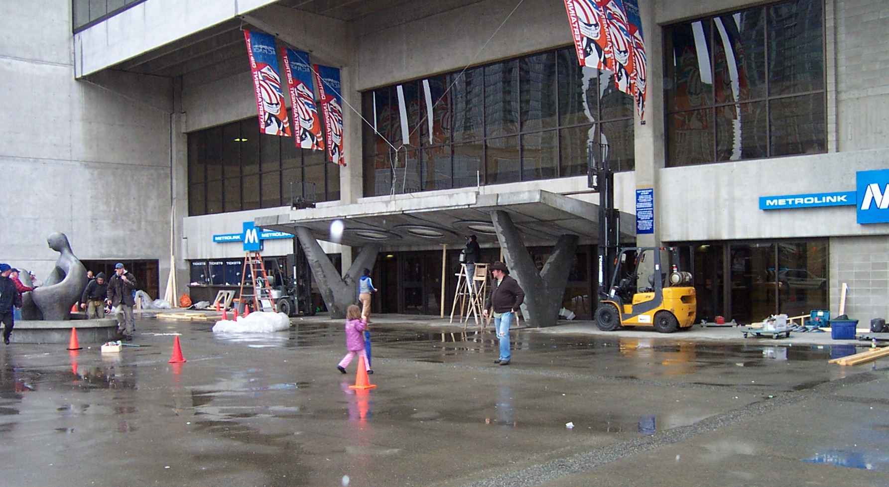 B.C. Place entrance, before our work to make it appear to be the entrance of a train station.