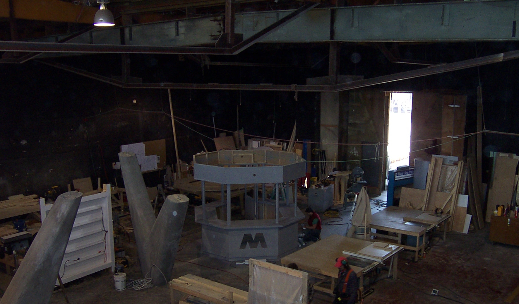 Building the pieces that will become the “Metro Link” station entrance, and installation work.