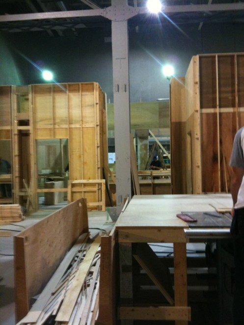 ..and (below) you can see in this shot that the exterior appearance of the various sets is all business. This was taken at the main studio set build for Endgame (2011). I was waiting for my turn to rip some wall “skins” at the table saw.